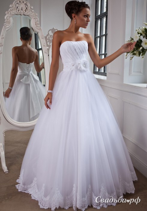 Свадебное платье Диона украшено нежнейшими кружевами шантильи. Эта невесомая модель с роскошной юбкой поможет создать невинный и свежий образ современной невесты. Драпированный корсет с открытой зоной декольте выгодно подчёркивает талию. Широкий пояс с цветком ручной работы придаёт модели особый шарм.