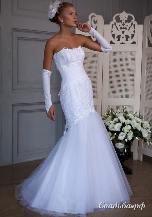 Свадебное платье Феррара выгодно подчёркивает все женственные изгибы фигуры. Эффектно драпированный корсет с открытой зоной декольте вручную расшит бисером и кружевом. От уровня колен начинается пышная фатиновая юбка с кокетливым шлейфом. Наряд привлекает внимание к бюсту. В таком платье вы будете неотразимы.