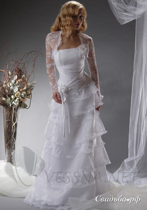 Свадебное платье Николь особенно гармонично смотрится в сочетании с кружевной накидкой-болеро. Оригинально драпированный корсет с открытой зоной декольте выгодно подчёркивает все женственные изгибы фигуры. Изящный поясок с цветком придаёт наряду особый шарм. Лёгкая юбка с многоярусными воланами доходит до самого пола.