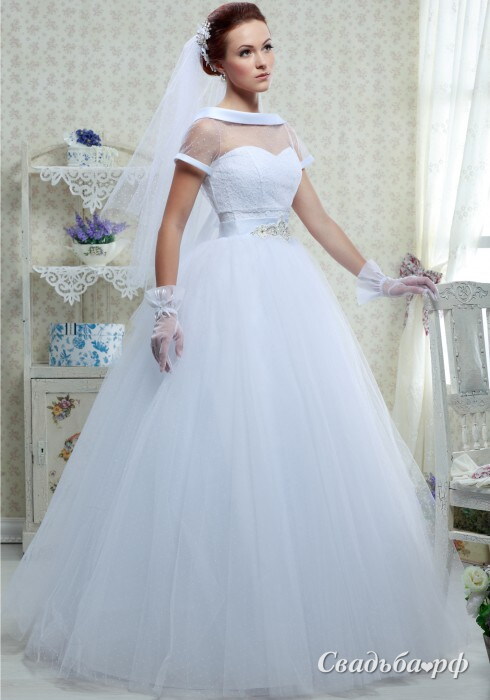 Платье Дениза эксклюзивно представлено в салоне Noelle. Этот изысканный наряд с полупрозрачной вставкой на груди и такими же рукавчиками смотрится эффектно. Воротничок и окантовка рукавов выполнены из более плотной ткани. Талия подчёркнута широким поясом со сверкающей вставкой. Пышная юбка из фатина струится до самого пола.