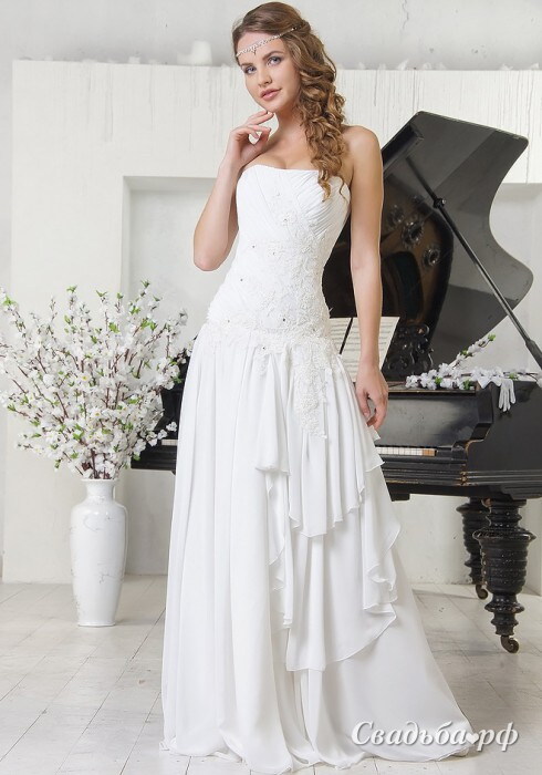 Свадебное платье Камея из новой коллекции 2014 года, изысканное и романтичное, представлено в свадебном салоне Noelle. Заниженный корсет с затейливыми складками драпировки и вышивкой ручной работы эффектно подчёркивает грудь и талию. Длинная юбка из нежной ткани украшена сбоку несколькими ярусами воланов. Почувствуйте себя настоящей богиней!