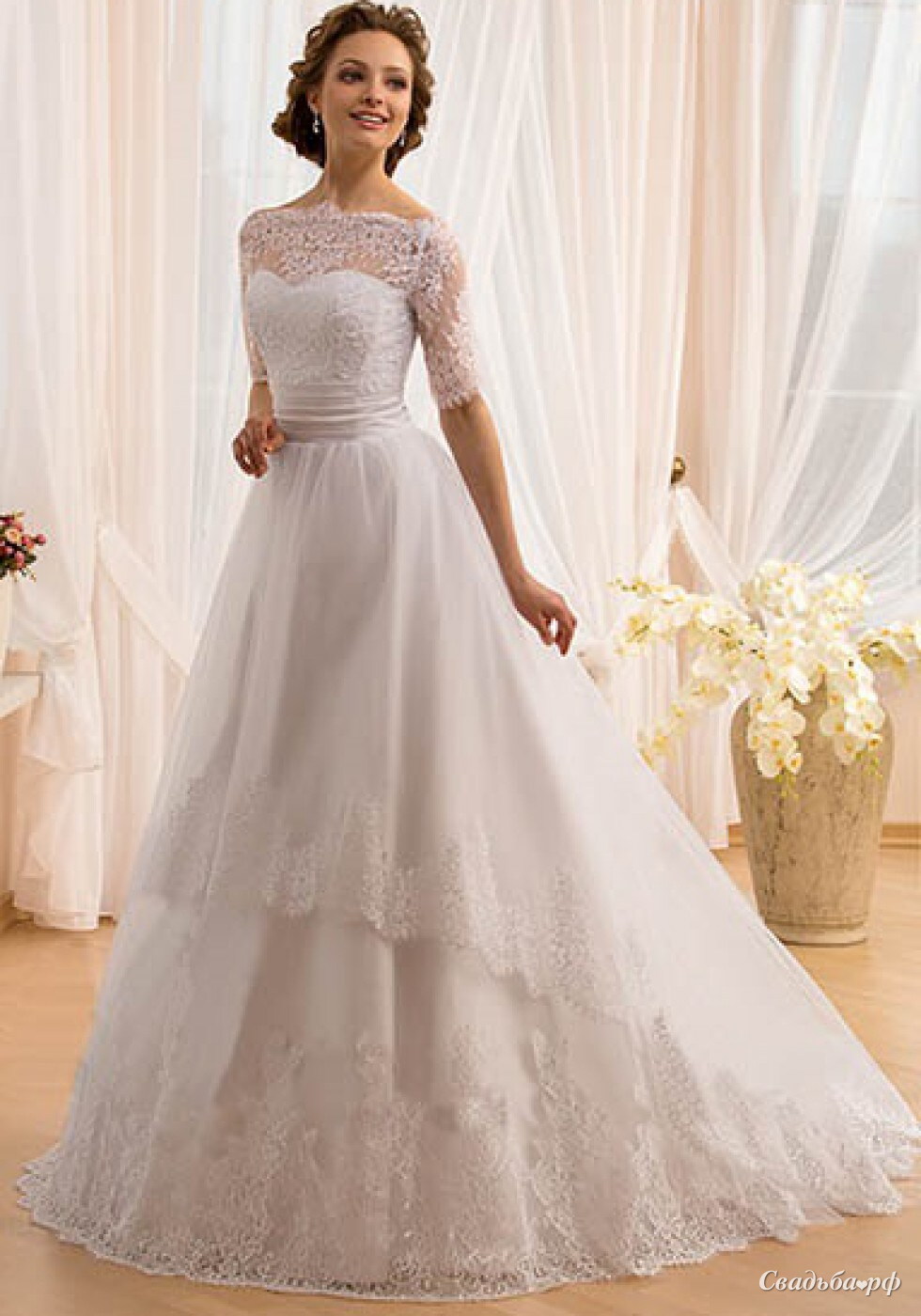 Модель Даная эксклюзивно представлена в свадебном салоне Noelle. Строгий корсет соблазнительно облегает грудь. Широкий атласный пояс эффектно выделяет линию талии. Великолепная юбка А-силуэта состоит из двух больших оборок. Эти оборки выполнены из полупрозрачной сетчатой ткани и украшены нежным кружевным орнаментом. Болеро съемное 3800 руб.