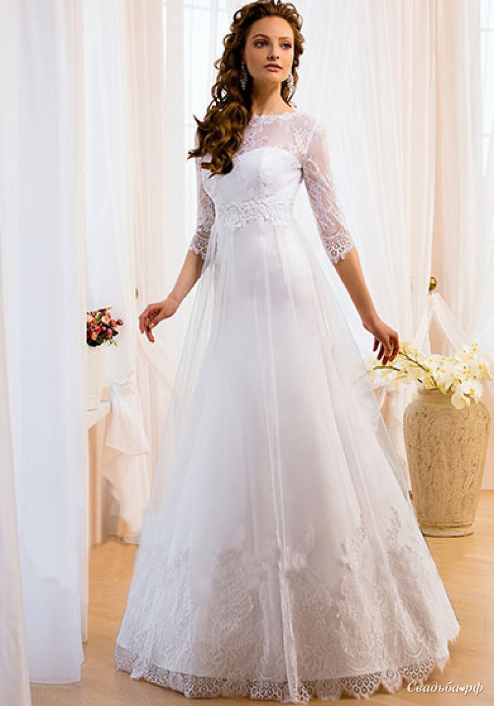 Романтичная модель платья Симфони из новейшей коллекции осень 2014 представлена в свадебном салоне Noelle. Закрытый верх наряда и полупрозрачные рукава 3/4 придают образу нежность и невинность. Длинная юбка с невесомым верхним слоем расширяется к полу. Платье с завышенной талией зрительно вытягивает силуэт. Наряд украшен вручную.