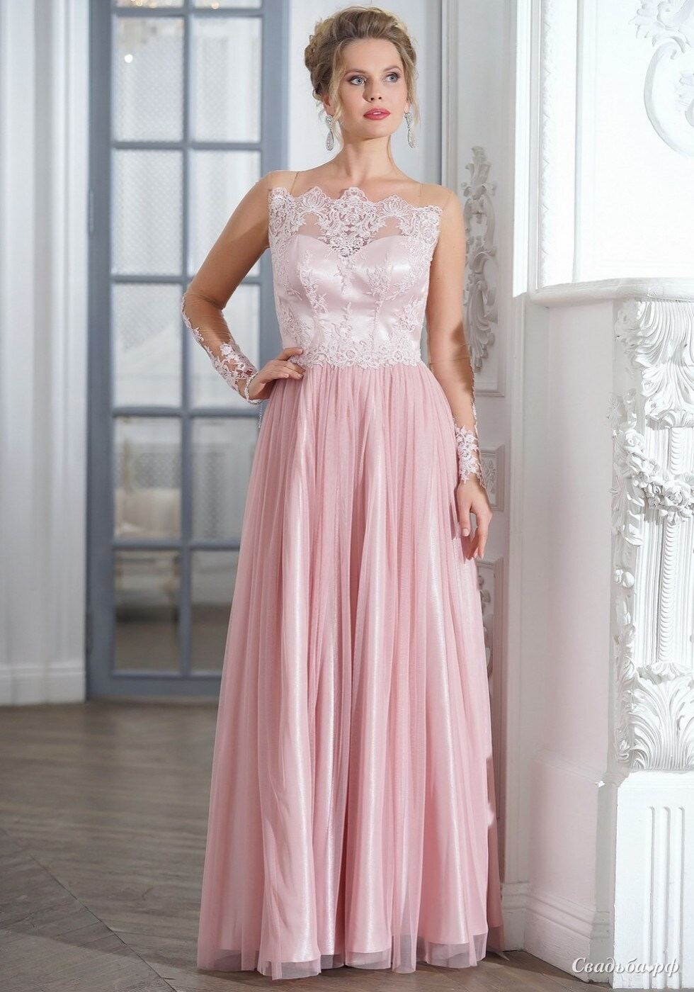 Женственное и изящное платье нежно-розового оттенка с шикарным кружевным верхом и длинной фатиновой юбкой. Спинка и рукавчики выполнены из прозрачного материала, но за счет элементов декора это не выглядит слишком откровенно. Хит продаж!