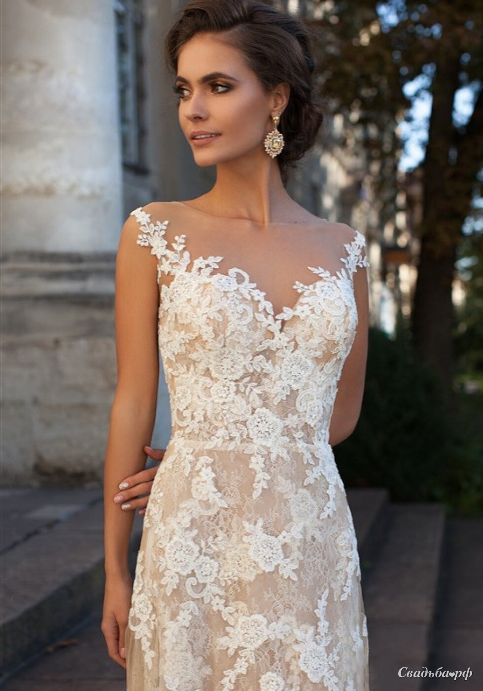 Платье соблазнительно облегает тело и расходится роскошным водопадом к низу, оставляя после себя волну - невероятный шлейф… Богатая кружевная вышивка на полупрозрачной сетке смотрится потрясающе! Кремовое кружево перекликается с основным цветом – цветом капучино. В этом платье Вы – бесценное сокровище! Коллекция 2017 года
