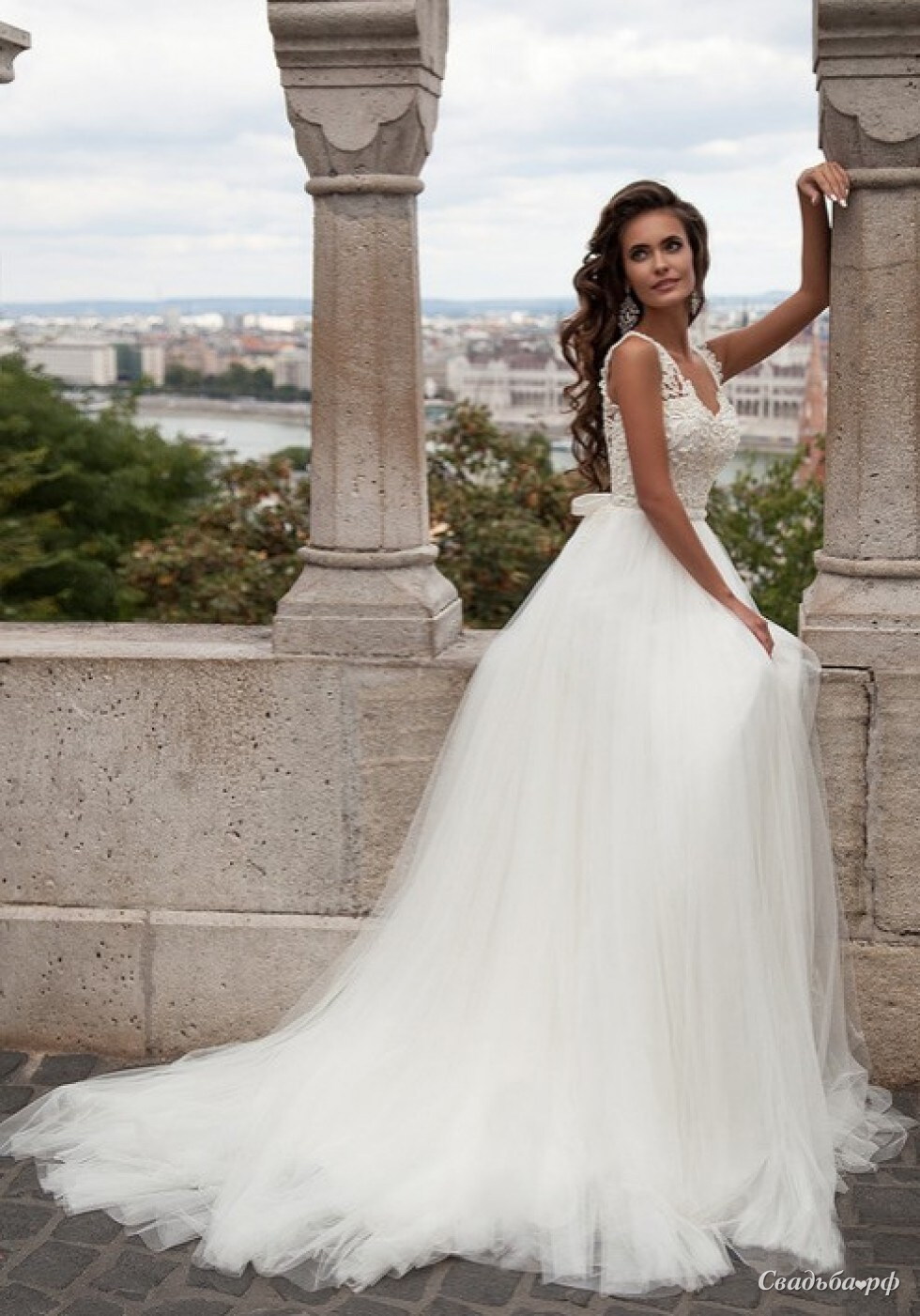 Платье-торжество. Богатый кружевной верх и спокойная фатиновая юбка с шикарным шлейфом притягивают к невесте все внимание без исключений. Коллекция 2017 года