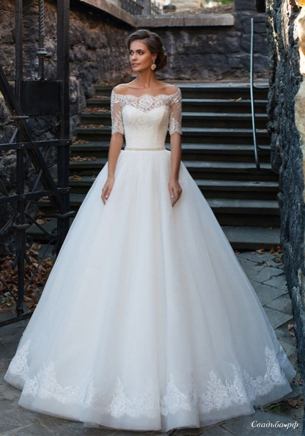 Платье-сказка, изящное, нежное, волшебное. Верх платья полностью выложен из кружева с рукавчиками, шикарная фатиновая юбка с кружевным краем к низу. Талия украшена аппликацией из жемчуга. Коллекция 2017 г.