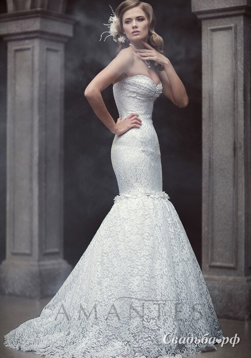Восхитительное свадебное платье силуэта русалочка выполнено из нежного хлопкового кружева. Этот элегантный наряд идеально садится по фигуре и выгодно подчёркивает достоинства. Лёгкие сборки на груди зрительно увеличивают бюст. От середины бедра облегающая юбка расширяется и постепенно переходит в кокетливый шлейф. Лаконичная модель для леди.