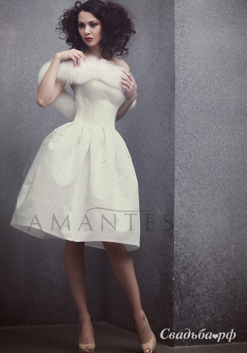 Оригинальное свадебное платье выполно из ткани рубчик. Сдержанность в декоре и безупречность форм оценят самые притязательные модницы. Корсет идеально сидит по фигуре и подчёркивает женственные изгибы. Пышная юбка с глубокими бантовыми складками слегка прикрывает колени. Идеальное платье в ретро-стиле.