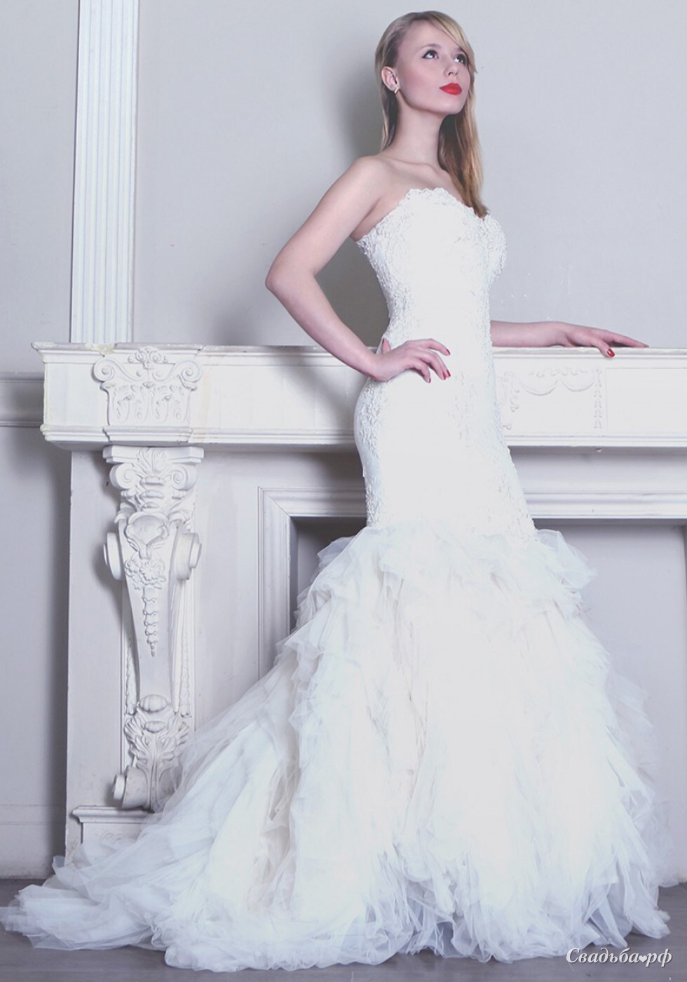 Платье силуэта русалочка, юбка из мягкой сетки, нашитой воланами. Цвет кремовый с переходом в бежевый.Кружево на корсете в винтажном стиле.