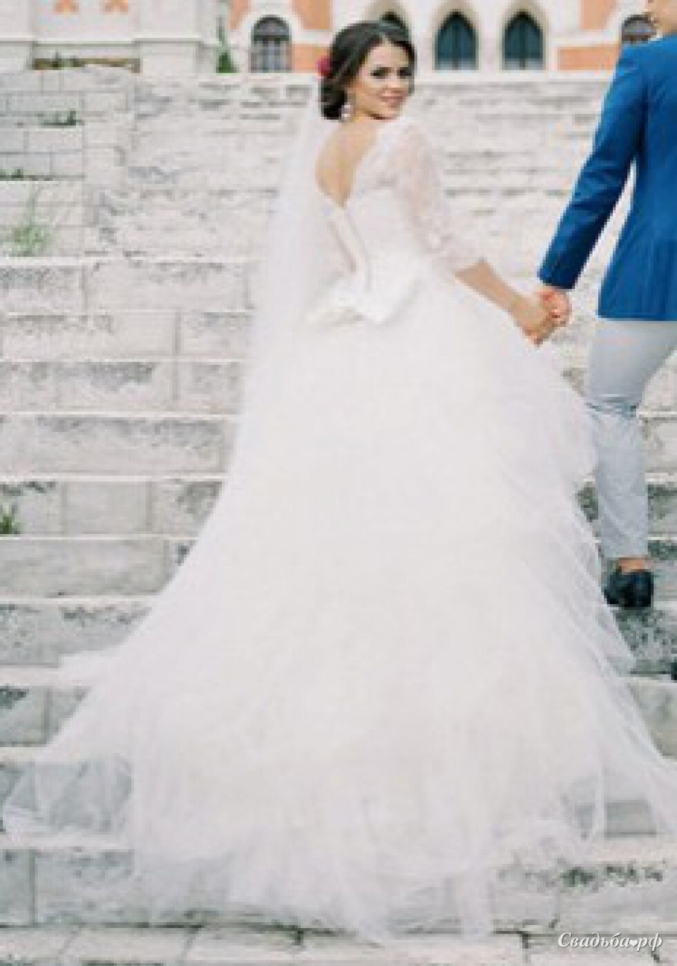 Королевское платье с пышной юбкой из мягкой сетки, уложенной несколькими слоями в виде хаотичных буфов, V-образный ажурный вырез декольте и рукава 3/4 добавят женственности вашему волшебному образу.