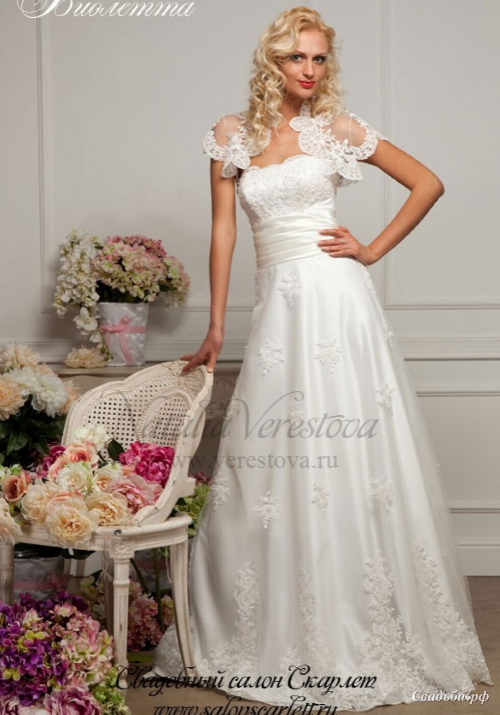 Платье декорировано кружевом, расшитым бисером белого и персикового цветов, линию талии выгодно подчеркивает широкий пояс-кушак. Небольшой шлейф придает особенный шик данной модели.
