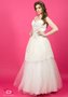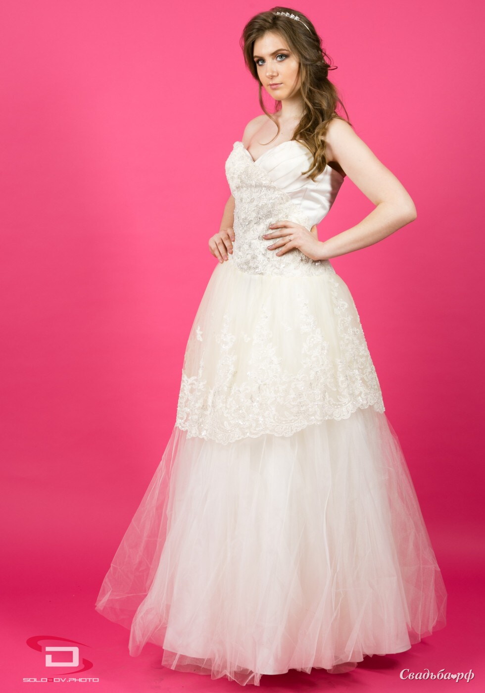 Платье с корсетом V-образного выреза асимметрично декорировано драпировкой из атласа и кружевом. Талия так же асимметрична. Фатиновый подол украшает длинная баска из кружева.
