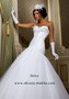 Верх платья открытый без бретелек. Вырез сердечком. Корсет вышит бисером, стразами и пайетками. Юбка пышная фатиновая.