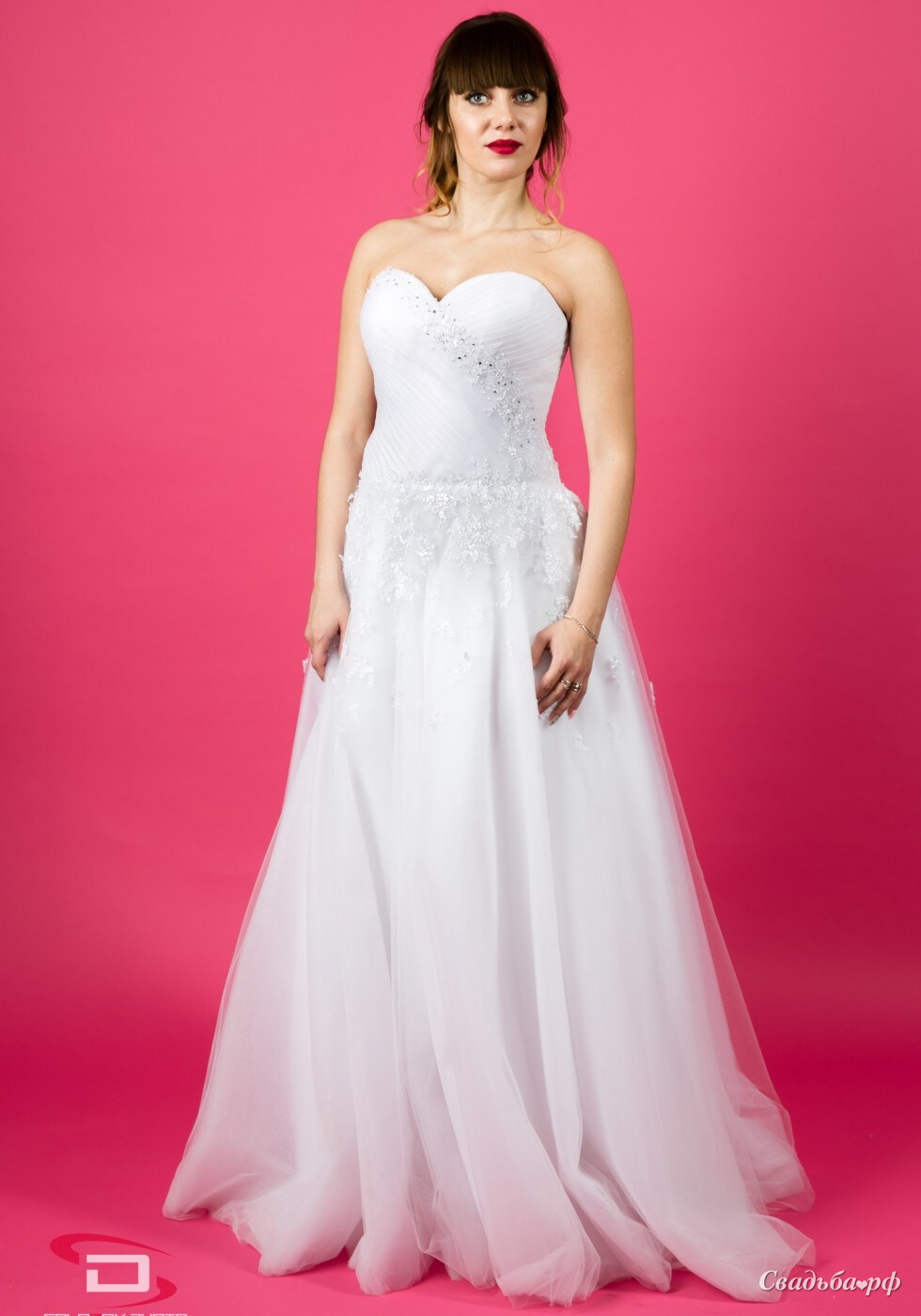 Элегантное платье с легкой фатиновой юбкой. Корсет драпирован и декорирован вручную стразами и кружевом.