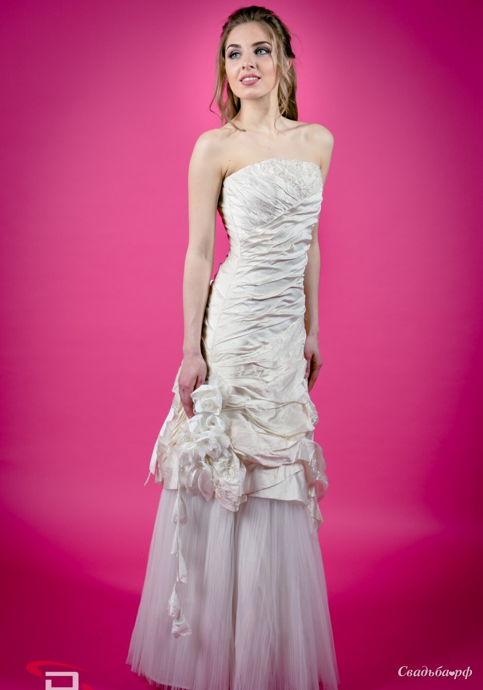 Элегантное драпированное платье, легкости придает нижняя часть подола выполненная из фатина, лиф украшен кружевом расшитым бисером.