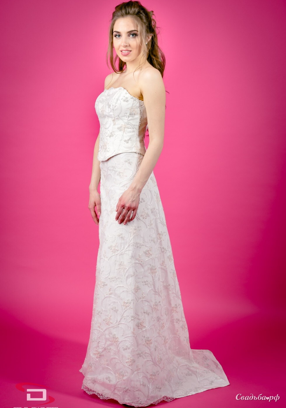 Необычайно нежный свадебный наряд! Ваша фигура будет выглядеть в нем очень женственно и утонченно. Все платье декорировано кружевом расшитым бисером.