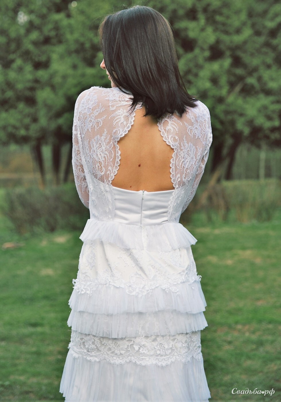 Оригинальное свадебное платье с юбкой испанкой и кружевным верхом с рукавами три четверти и открытой спинкой.