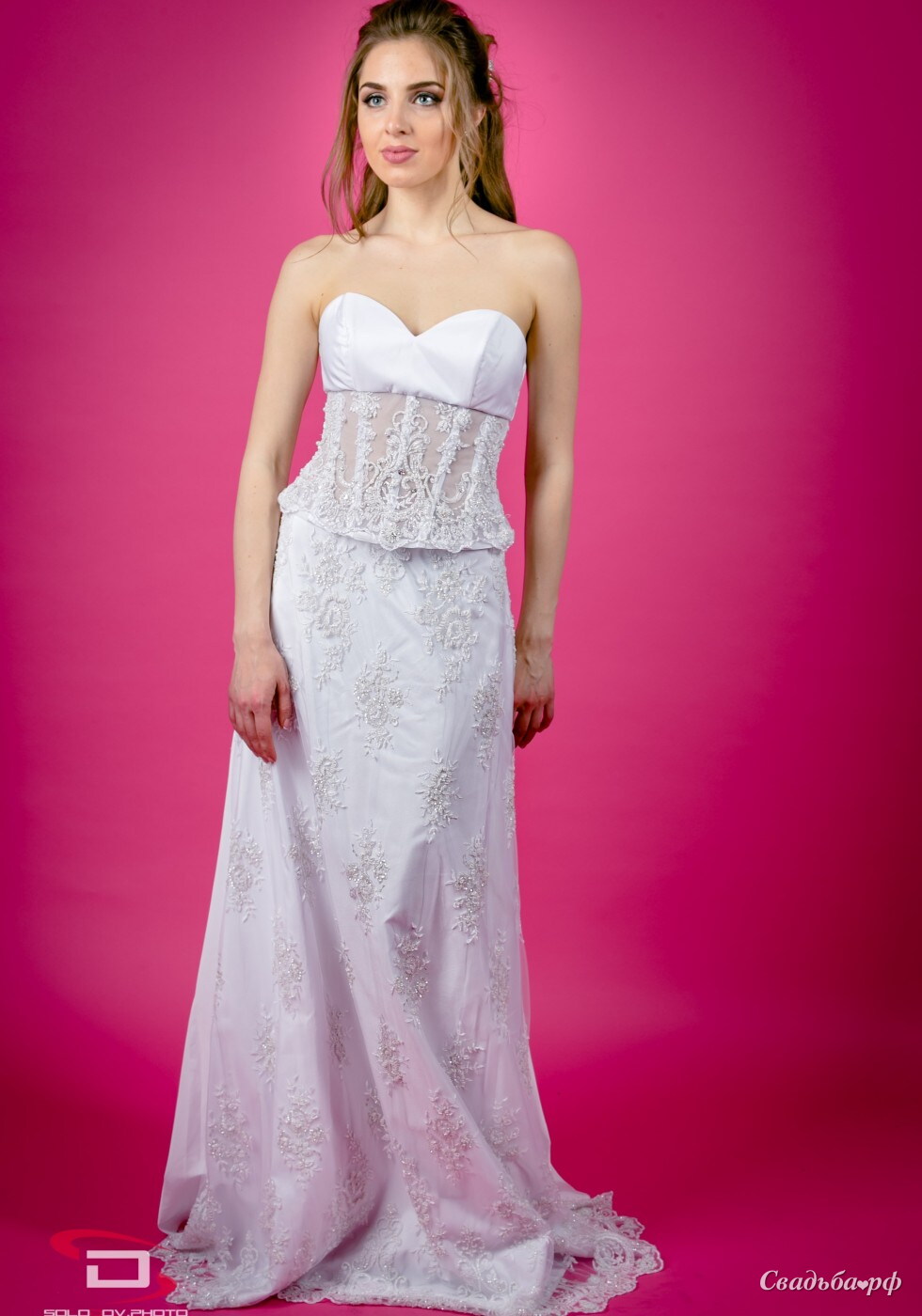 Женственное свадебное платье с кружевной юбкой в пол и полупрозрачным кружевным корсетом.