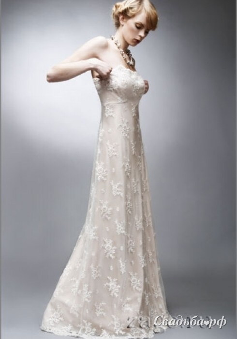 Платье пошито из давно актуального материала для свадебных нарядов – расшитого кружева. Свадебный наряд имеет прямой покрой с завышенной талией. Открытый лиф хорошо держит форму. Кружевная ткань свободно струится, спускаясь до самого пола. Красиво с таким платьем будет сочетаться романтичная высокая прическа сос свободными прядями, аккуратные серьги и объемное колье в виде крупных цветов.