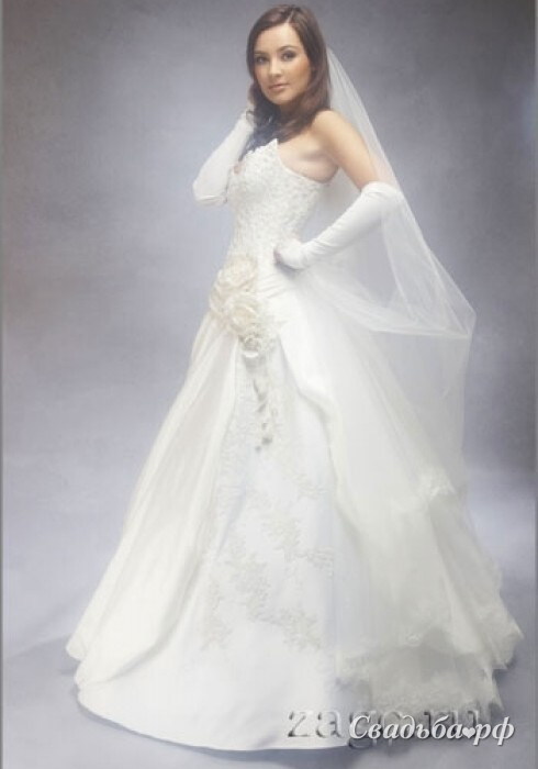 Свадебный наряд, достойный королевы. Плотный корсет расшит мельчайшим искусственным жемчугом и бисером, пышная атласная юбка дополнена асимметричными ярусами фатина. Нежнейшая вышивка ручной работы, оригинальная драпировка, аппликация из крупных цветов - все это придает этому платью изысканность и оригинальность.