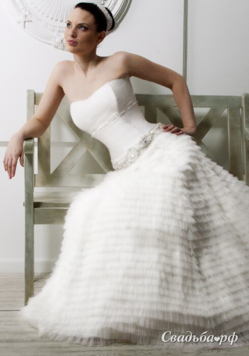 В этом свадебном платье плотный корсет из гладкой ткани гармонично сочетается с пышной фатиновой юбкой в мельчайшую многослойную складку. На талии невесты будет красоваться поясок, полностью украшенный мелким бисером и стразами. Это платье - идеальный вариант для невест, которые не любят излишества и чрезмерные детали.
