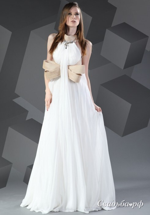 Оригинальное свадебное платье с открытыми плечами и стоечкой под самое горло. Представленная модель с завышенной талией и длинной юбкой выполнена из тончайшего шифона. Объёмный бант спереди смотрится пикантно. Максимально открытая спинка придаёт образу игривость и непередаваемый шарм. В комплекте с платьем идёт палантин.