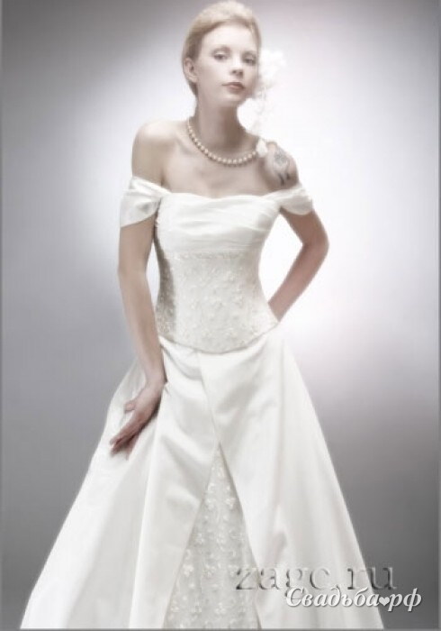 Белоснежное свадебное платье подойдет для традиционной свадьбы. Лиф платья драпирован небольшими складками, ниже уровня груди корсет украшен мерцающими стразами. Открытые плечи добавляют изящества и кокетства. Лучший выбор свадебного туалета для новобрачной высокой и стройной, с хорошей фигурой. Обязательно наденьте колье и диадему.