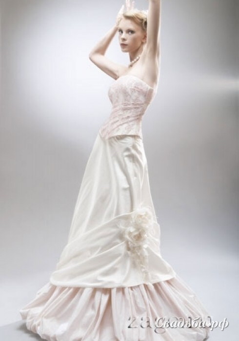 Необычное и изящное нежно-розовое свадебное платье. Лиф платья имеет классическую форму, а нижняя часть корсета задрапирована ассиметричными складками. Юбка имеет несколько уровней и декорирована цветочной композицией. Нижний уровень юбки выполнен в виде крупных воланов. Аочувствуйте себя настоящей принцессой.
