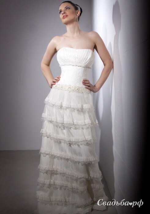Эффектное свадебное платье с открытой зоной декольте и прямым покроем. Тончайшая драпировка корсета и тонкая вышитая полоса под грудью зрительно увеличивают бюст. Длинная юбка из множества ярусов просто великолепна. Имеется в наличии 44-46 размер в айвори цвете, основа годе, скошенный корсет, юбка со шлейфом, испанский стиль.