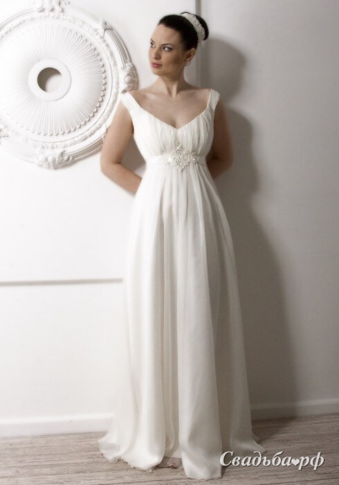 44 р, 46 р, 48 р, 50 р в белом и айвори цвете. Подгонка по фигуре. В наличии несколько моделей подобного силуэта. Элегантное свадебное платье в греческом стиле. Материал платья – шифон. Лиф драпирован в мелкую складочку. Завышенную линию талии подчеркивает декоративное украшение со стразами. Наряд выдержан в лаконичном стиле и не перегружен яркими деталями.