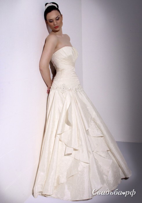 Элегантное свадебное платье. Лиф бандо и корсет украшены драпировкой с эффектом запаха. На бедрах кружевная лента с вышивкой из стекляруса. Многослойная юбка в форме колокола с асимметричными воланами и небольшим шлейфом. Изящный, гордый образ дополнит приподнятая прическа. В этом наряде вы будете неповторимы.