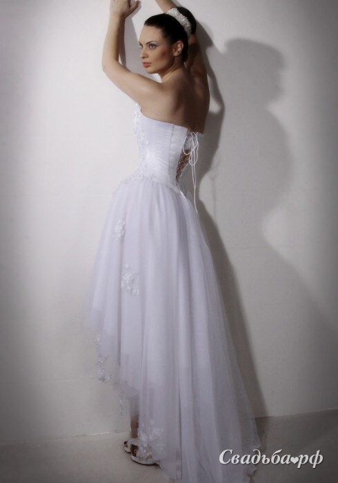 Интересное и необычное платье-трансформер. Корсет на шнуровке и пышная от бедер юбка создают великолепные плавные линии между женственными формами. Топ спереди драпирован, а юбка спереди немного короче, чем сзади. Открытый лиф с глубоким декольте. Шикарный наряд для невесты небольшого или среднего роста.