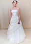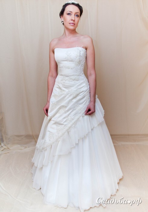 Очаровательное свадебное платье А-силуэта с открытой зоной декольте и скошенной драпировкой на пышной юбке никого не оставит равнодушным. Представленный наряд эффектно подчёркивает все достоинства фигуры. Юбка и рюшка могут быть заменены на фатин или органзу. Отличный вариант для современных и самых стильных невест.