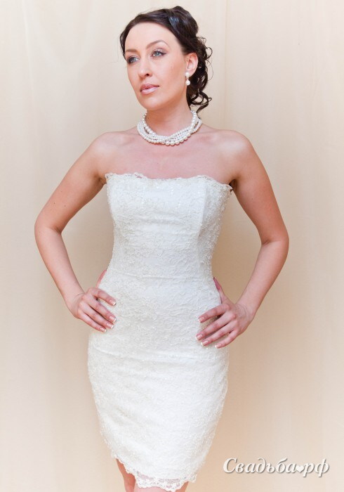 Эффектное платье-трансформер поможет вам предстать на свадьбе в двух образах. Соблазнительный наряд-футляр с открытой зоной декольте и коротенькой юбочкой до середины бедра выгодно подчеркнёт все достоинства фигуры и позволит вам продемонстрировать свои прекрасные ножки. Модель дополнена длинной юбкой, которая легко надевается и снимается.