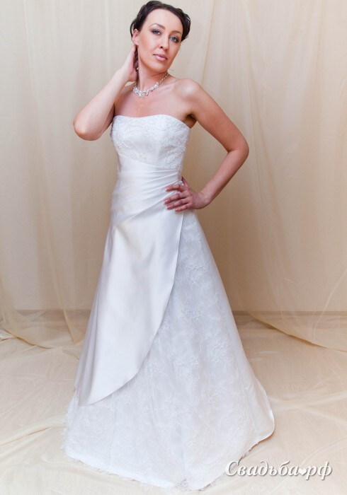 Силуэт представленной модели создается за счет плавной полукруглой линии, пересекающей юбку от пояса и почти до самого низа платья. Такой свадебный наряд является идеальным вариантом для многих типов фигур, в том числе и для девушек, у которых верхняя часть фигуры немного крупнее нижней. Цветочные узоры ткани создают эффект лёгкости и воздушности, а отсутствие лямок подчеркнет красоту Ваших рук и плеч.
