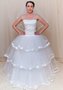 Поистине королевское свадебное платье придётся по вкусу самым жизнерадостным и кокетливым красавицам. Элегантный корсет с открытой зоной декольте украшен лентой и бантиком под грудью. Наряд привлекает внимание к бюсту и выгодно подчёркивает талию. Каждый ярус фатиновой юбки декорирован атласной полосой.