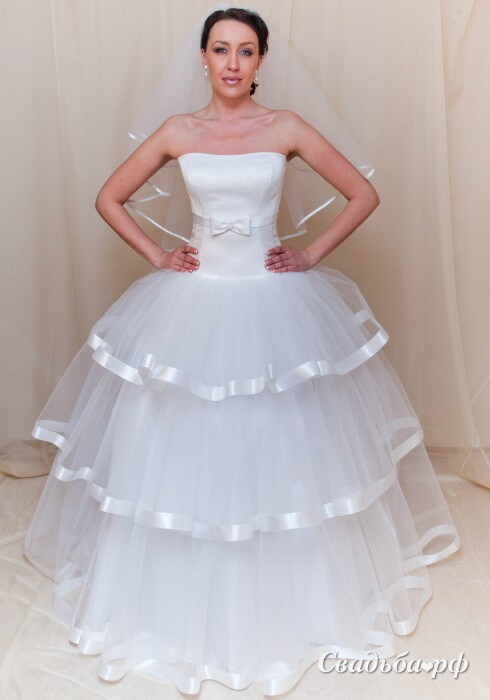 Поистине королевское свадебное платье придётся по вкусу самым жизнерадостным и кокетливым красавицам. Элегантный корсет с открытой зоной декольте украшен лентой и бантиком под грудью. Наряд привлекает внимание к бюсту и выгодно подчёркивает талию. Каждый ярус фатиновой юбки декорирован атласной полосой.