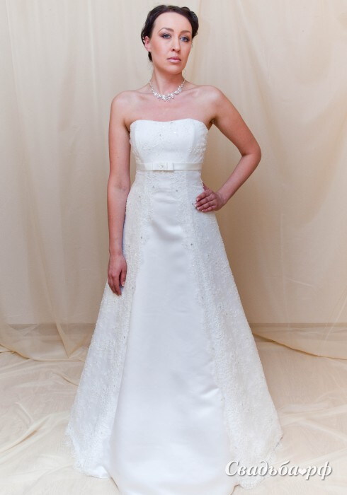 Элегантное свадебное платье А-силуэта. Плотный корсет с открытой зоной декольте и изящной лентой под грудью выгодно подчёркивает все женственные изгибы фигуры. Длинная юбка с широкими клиньями постепенно расширяется к полу. Потрясающее сочетание благородного атласа и нежного кружева никого не оставит равнодушным.