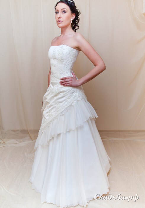 Великолепное свадебное платье с открытой зоной декольте подчеркнёт все женственные изгибы вашей фигуры. Изящный корсет украшен ручной вышивкой. Верхняя часть пышной юбки декорирована более плотной драпировкой и дополнительным воланом. Наряд состоит из двух частей. В этой роскошной модели вы будете неотразимы!