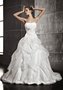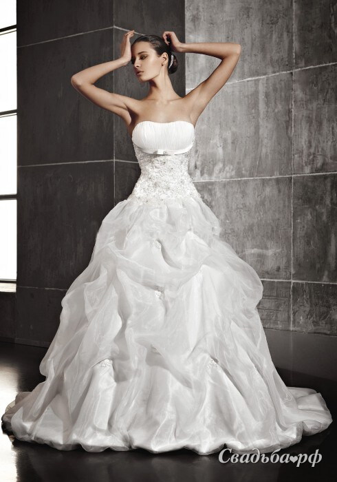 Нежное свадебное платье с шифоновой невесомой юбкой, декорированной крупными прихватами. Изысканный корсет расшит стеклярусом и стразами Сваровски. Очень красиво и соблазнительно открытые руки и плечи. Лиф изделия задрапирован, под грудью атласная лента с очаровательным бантиком. Это роскошное платье отлично подойдет для самого пышного торжества.