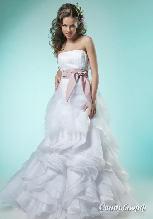 Неизбитый фасон, модель рыбка, но за счет курчавых, волнистых складок из полупрозрачного шифона, изъяны в фигуре скрываются. Отличная посадка. Талия подчеркивается лентой и милым бантом из атласа.
