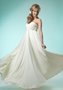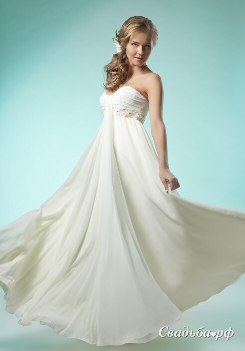 Струящееся платье из роскошного шифона, который словно белоснежный водопад ниспадает в пол, открывая плечи и подтягивая грудь невесты благодаря шифоновому галстуку на лифе декорировано легкой драпировкой.А грудь подчеркивает изящная лента вышивки бисером. Платье хорошо подходит для беременных девушек.