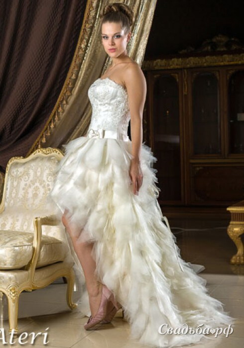 Свадебное платье - трансформер придётся по вкусу самым стильным невестам. Укороченная спереди верхняя юбка, соединенная с корсетом, выполнена из нежнейшего фатина оригинальной фактуры и комплектуется съемной длинной юбкой. Корсет украшен кружевом и стеклярусом, а игривый атласный поясок подчеркивает талию.