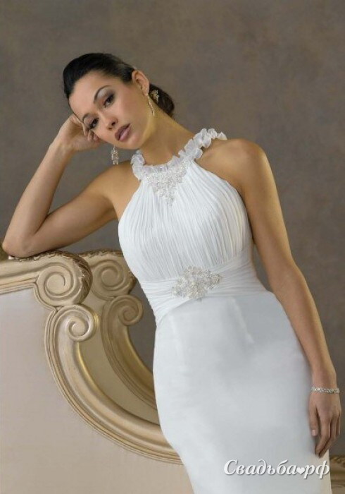 Оригинальное свадебное платье с открытыми плечиками и очаровательными оборками около шеи придётся по вкусу даже самым притязательным невестам. Верх наряда выполнен из плиссированного шифона. Талия эффектно подчёркнута поясом со сверкающей вышивкой. Длинная юбка струится до самого пола. В наличии имеются размеры 48 и 50.
