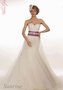 Эффектное свадебное платье с открытой зоной декольте и воздушной юбкой никого не оставит равнодушным. Изящный корсет зрительно увеличивает грудь. Широкий цветной пояс со сверкающей вышивкой ручной работы акцентирует внимание на стройной талии невесты. Нижняя юбочка-годе покрыта несколькими слоями невесомого фатина.