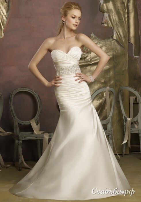 Очень простое и, в то же время, невероятно стильное платье. Складки нежнейшего атласа, выложенные на открытом лифе и корсете оригинальной асимметричной драпировкой, выгодно подчеркивают фигуру, хорошо скрывая её мелкие недостатки. Лиф сердечком соблазнительно обтягивает грудь. Широкий пояс, расшитый бисером и стеклярусом, акцентирует линию талии.