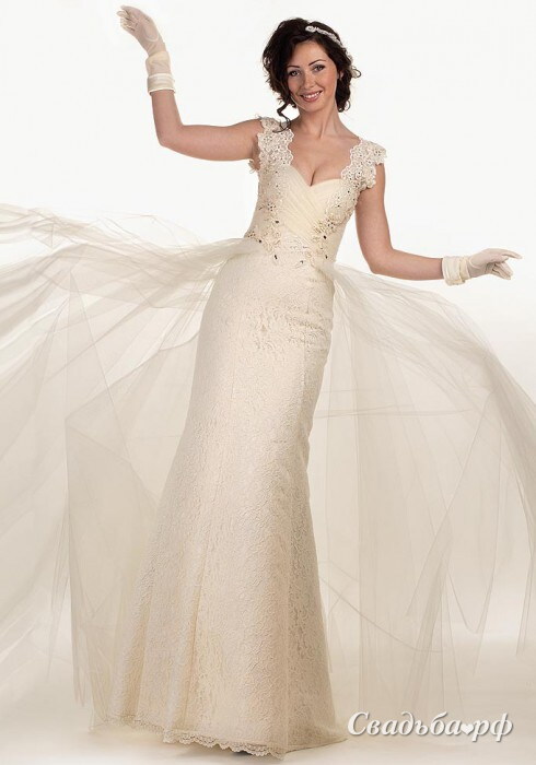 Кружевное свадебное платье. Прямой покрой с небольшим намеком на силуэт рыбка. Фигурный лиф и корсет украшены драпировкой и изысканным кружевом. Особенно эффектно выглядят широкие кружевные бретели на фоне нежной кожи плеч. Юбка сверху может быть задрапирована фатином. Нежный и изысканный образ для самого торжественного дня.