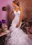 Элегантное свадебное платье силуэта Рыбка. Удлинённый корсет с соблазнительным открытым фигурным лифом украшен изысканной мягкой драпировкой, которая эффектно подчёркивает все достоинства женской фигуры. Сбоку расположена оригинальная брошь. Юбка состоит из множества легчайших оборок, каскадом струящихся вдоль фигуры.