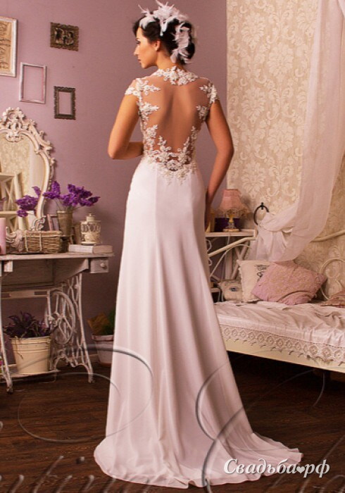 Элегантное струящееся свадебное платье. Очень оригинально оформлена спинка модели. Великолепные кружевные узоры в цветочных мотивах окаймляют спину, эффектно подчёркивая изящество изгибов женской фигуры. Мягкая, слегка расширенная книзу юбка спокойно струится вдоль ног, ниспадает на пол и превращается в небольшой элегантный шлейф.